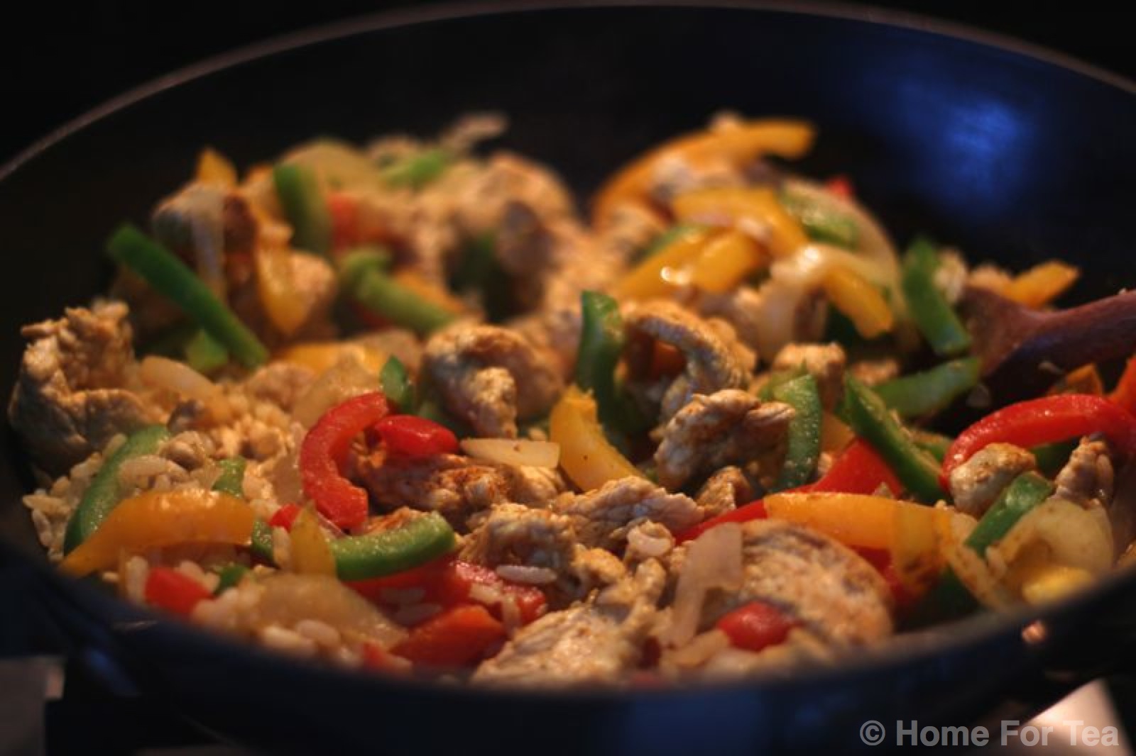 PS – you will note in the instructions that the green pepper is added later than the other peppers, that is because one of my pet hates is when green veg in a stir fry turns a kind of grey colour if cooked too much. I like to cook it so that it retains it’s lovely green colour as the dish looks so much more attractive.