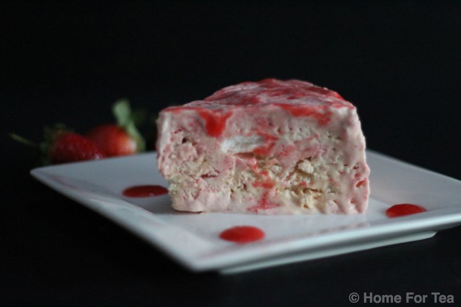 To serve: Take the frozen cake from the freezer, unclip the tin and carefully lift out the ‘cake’. Remove the cling film from the sides of the cake, then use a palette knife or metal fish slice to carefully transfer the cake from the base of the tin to a serving plate. Cut into slices to serve, either on its own or with fresh strawberries.